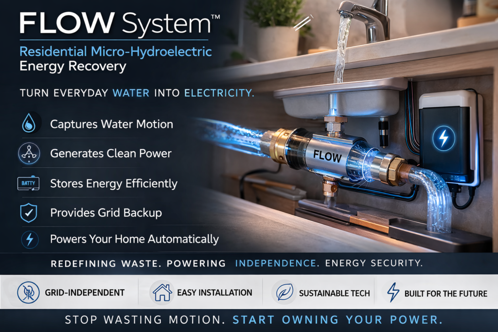 The FLOW System™ captures that motion and converts it into stored electrical power— automatically.Installed directly within your home’s plumbing infrastructure, FLOW uses advanced micro-hydroelectric technology to transform routine water use into renewable energy.