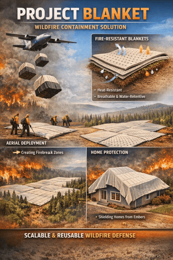 As climate change intensifies, wildfires are becoming more frequent, destructive, and difficult to control. Project Blanket is a forward-thinking wildfire containment concept designed to help firefighters slow or stop the spread of fires before they reach critical ecosystems, communities, and infrastructure.