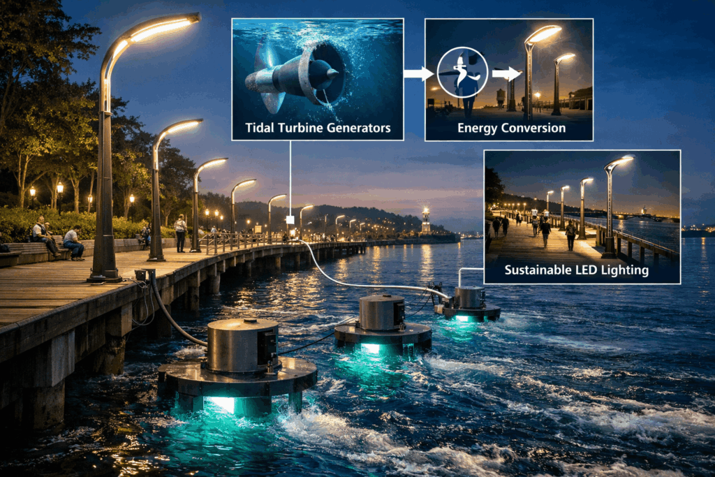 Project Illumination is an innovative lighting solution that converts the kinetic energy of tides and river currents into renewable power. Designed for waterfront environments, the system captures the natural motion of water and transforms it into electricity used to illuminate promenades, piers, boardwalks, and coastal communities.